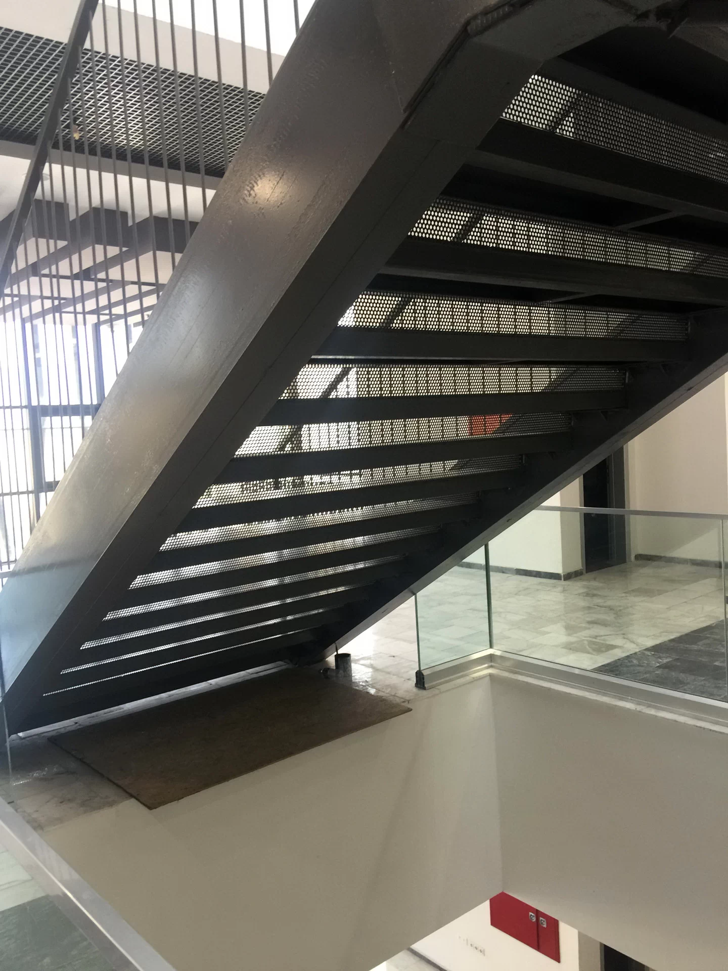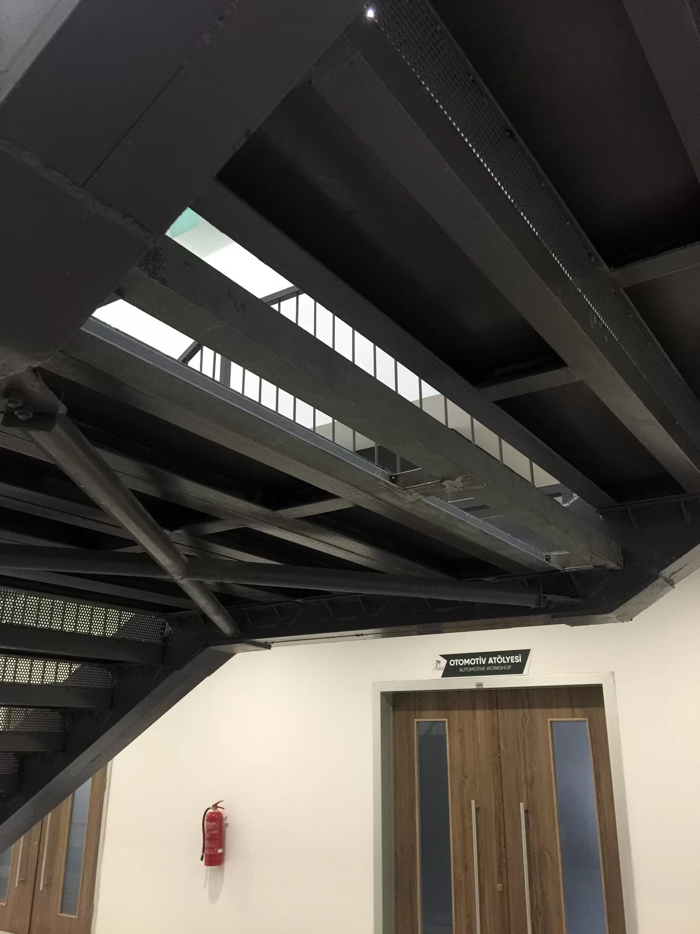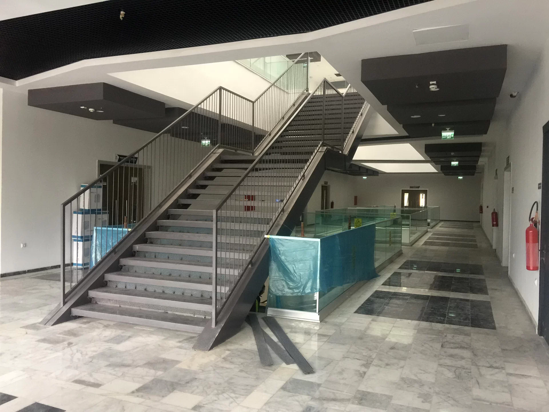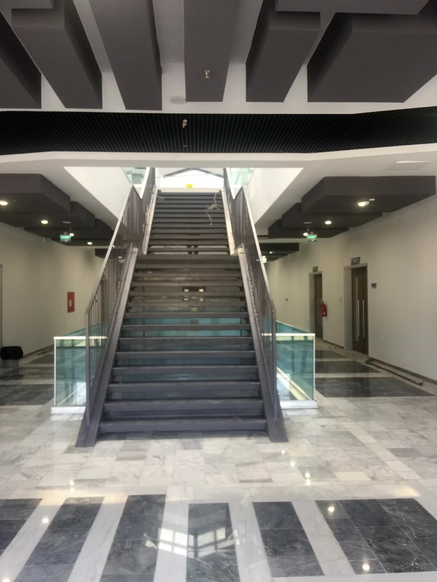 В пространстве атриума (галереи) Карaбюкского университета – Технического училища ТОББ были выявлены конструктивные недостатки существующих стальных лестниц, создававшие риски безопасности, включая чрезмерные зазоры в площадках и между элементами лестницы.